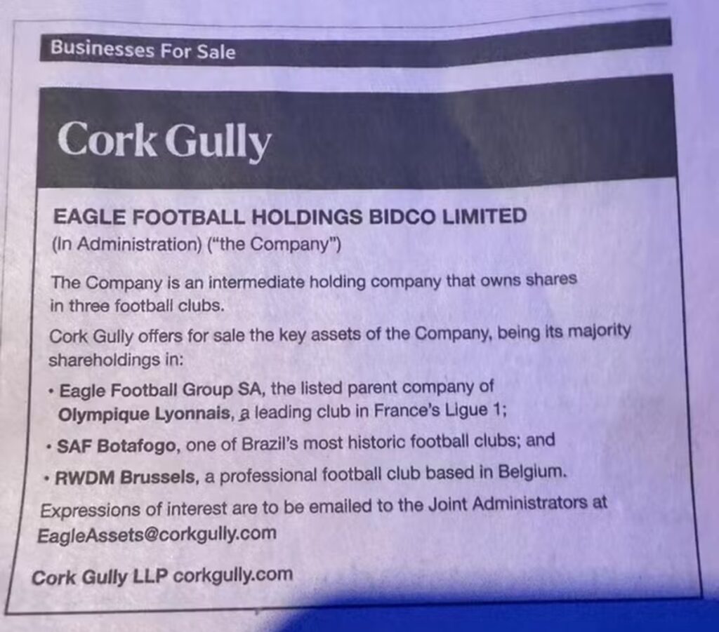 De acordo com a empresa inglesa de reestruturação financeira, o Botafogo é tratado como “um dos clubes de futebol mais históricos do Brasil”, o que tende a despertar o interesse de novos acionistas. Na prática, a SAF tricampeã brasileira está inclusa na venda da Eagle, que também conta com Lyon (França) e RWMD Brussels (Bélgica), o antigo Molenbeek.
