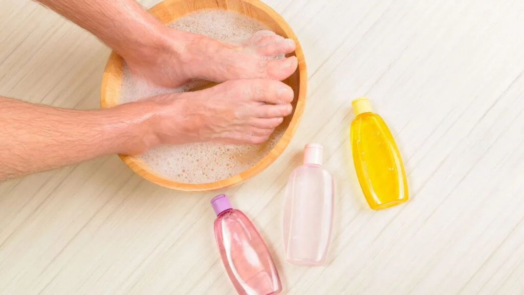 - Deixar os pés de molho: Descanse entre 15 a 20 minutos enquanto a solução faz efeito;