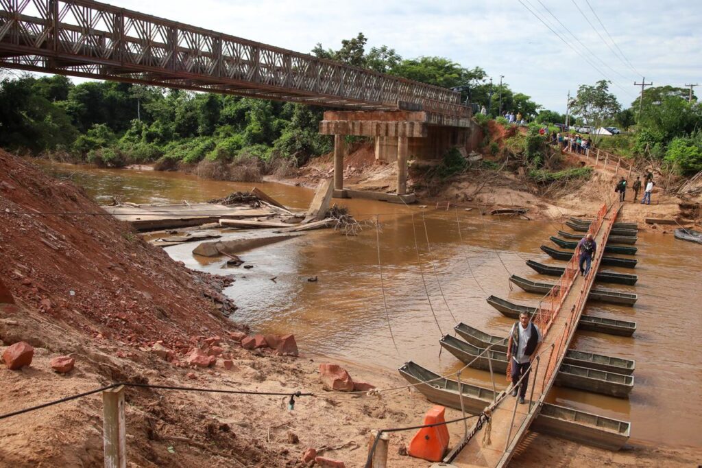 Após os danos causados pelas fortes chuvas que atingiram o município de Rio Negro, no Mato Grosso do Sul, o governo estadual iniciou uma força-tarefa para restabelecer a ponte de travessia sobre o Rio do Peixe. Nesta semana, o governador Eduardo Riedel (Progressistas) vistoriou a obra emergencial no local, que já conta com uma estrutura provisória para garantir o fluxo de veículos na região.