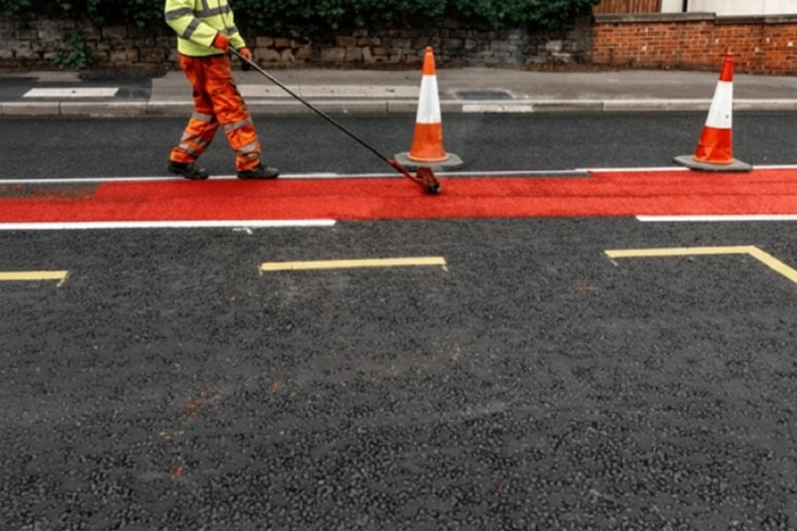 A “carretera roja” utiliza um pigmento vermelho no pavimento, criando um contraste visual que alerta os motoristas e incentiva a redução da velocidade, sem a necessidade de semáforos ou controles adicionais.