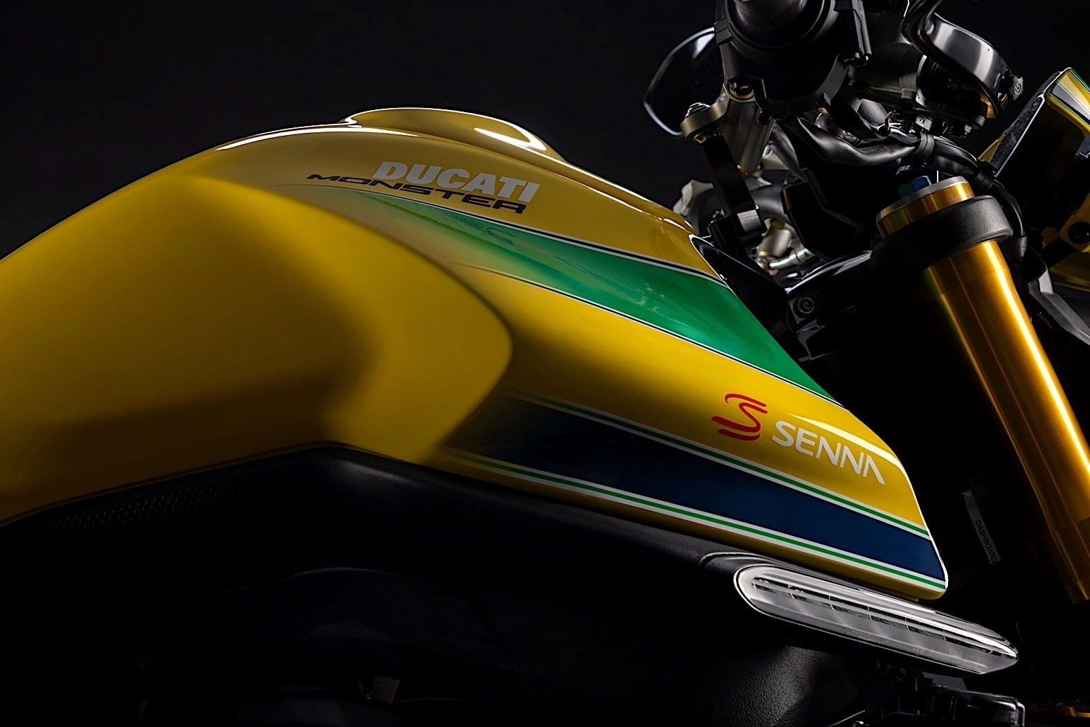 Tratando o lendário piloto brasileiro com singularidade, a Monster Senna foi feita cuidadosamente para lembrar o poder de Ayrton dentro das pistas. Sob duas todas, a motocicleta estampou pintura fazendo alusão ao capacete icônico de Senna, contando com as cores predominantemente amarela com detalhes em verde e azul.