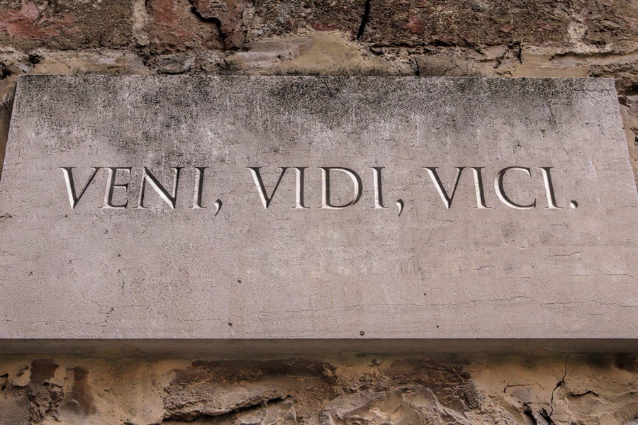 A expressão “Veni, Vidi, Vici”, que em latim significa “Vim, vi, venci”, é uma das frases mais célebres da Antiga Roma. Ela foi proferida por Júlio César após sua vitória rápida e decisiva sobre Farnaces II do Ponto, na Batalha de Zela, em 47 a.C. A frase resume a eficiência militar e a capacidade de decisão do general romano, sendo uma referência histórica de ação rápida e triunfo concreto.
