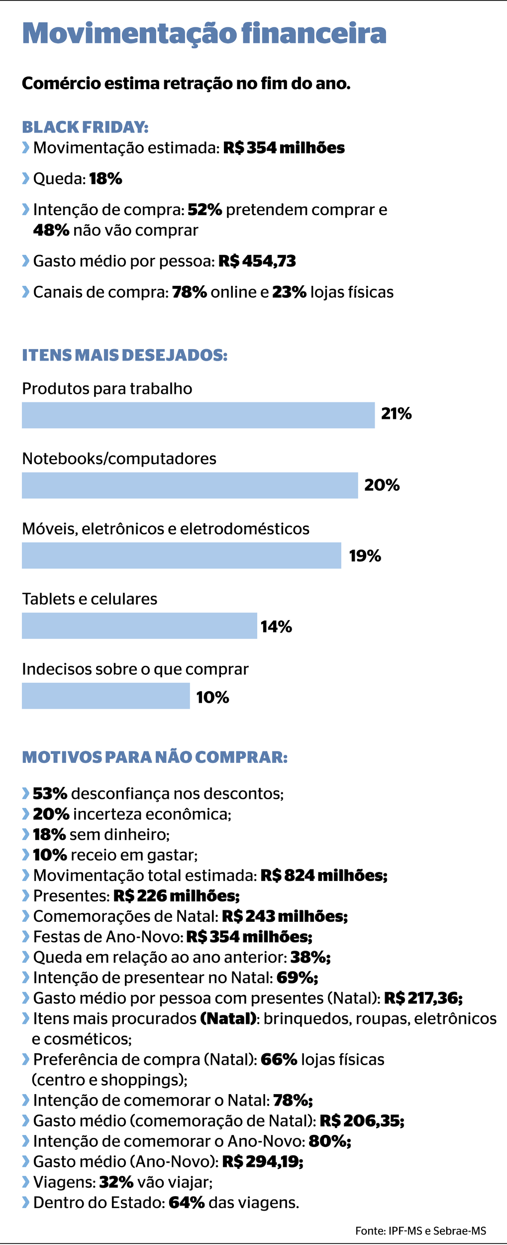 A Black Friday deste ano deve movimentar R$ 354 milhões no comércio de Mato Grosso do Sul, valor que representa queda de 18% na comparação anual. Do total de entrevistados, 52% pretendem comprar, mas 48% dizem que não devem consumir na data. Entre os que vão às compras, o digital domina: 78% farão compras online, enquanto 23% vão às lojas físicas. No presencial, o centro da cidade lidera como destino principal, com 43% da preferência, seguido pelos shoppings (27%), galerias (13%) e bairros (12%).
