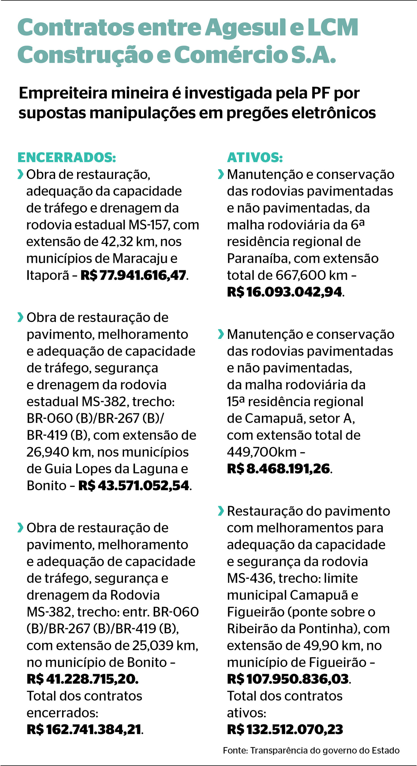 “A investigação encontra-se em fase inicial, não havendo, até o momento, qualquer decisão judicial determinando a suspensão ou a rescisão dos contratos administrativos firmados entre a Agesul e a referida empresa. Os contratos celebrados pela Agesul com a LCM não possuem relação com o objeto da investigação conduzida pela Polícia Federal”, diz nota da agência.
