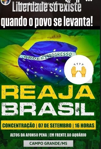 Ato “Reaja Brasil” ocorre neste domingo, feriado de 7 de setembro – Independência do Brasil, às 16 horas, em frente ao Bioparque Pantanal, nos altos da avenida Afonso Pena, em Campo Grande.