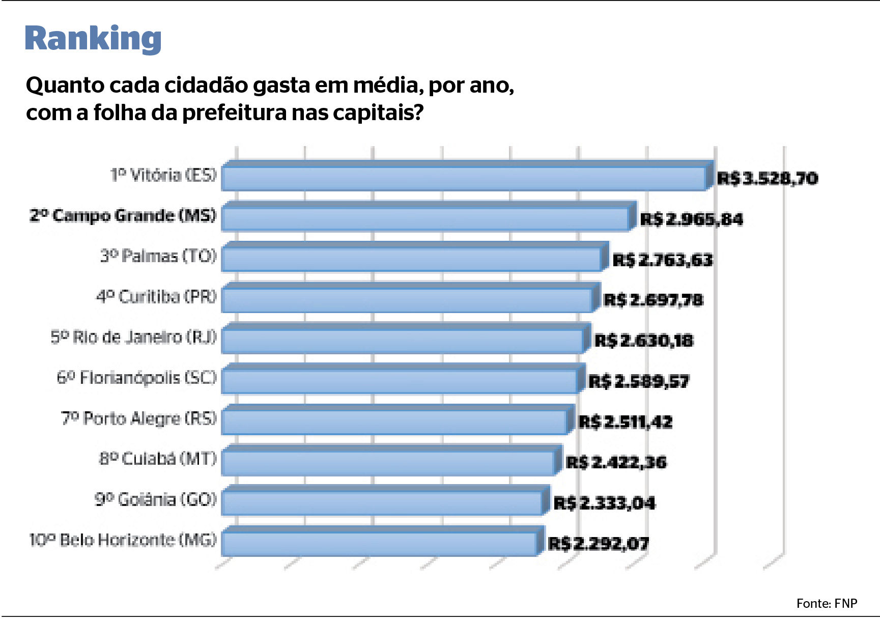 Em relação aos municípios mais populosos do Brasil, Campo Grande está no topo do ranking, só fica atrás de Niterói (RJ), que gasta com folha de pagamento R$ 3,92 mil por habitante, e Santos (SP), cujo gasto per capita com folha é de R$ 3,49 mil.