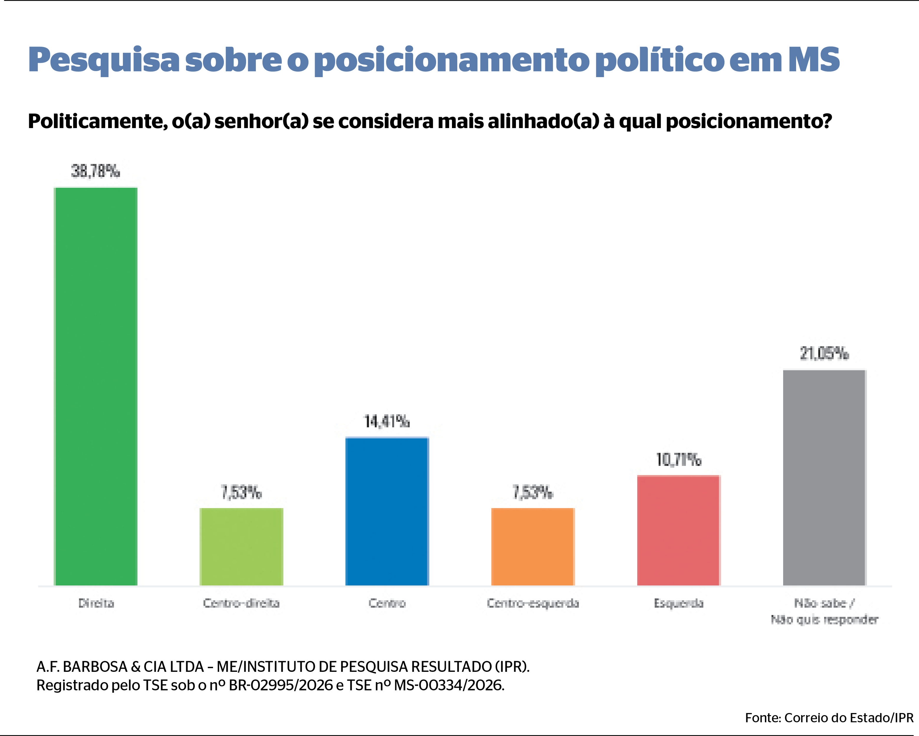 A maioria da população sul-mato-grossense se considera mais alinhado à direita ou à centro-direita, conforme pesquisa de intenções de votos, registrada sob os números BR-02995/2026 e MS-00334/2026, contratada pelo Correio do Estado e realizada pelo Instituto de Pesquisa Resultado (IPR).