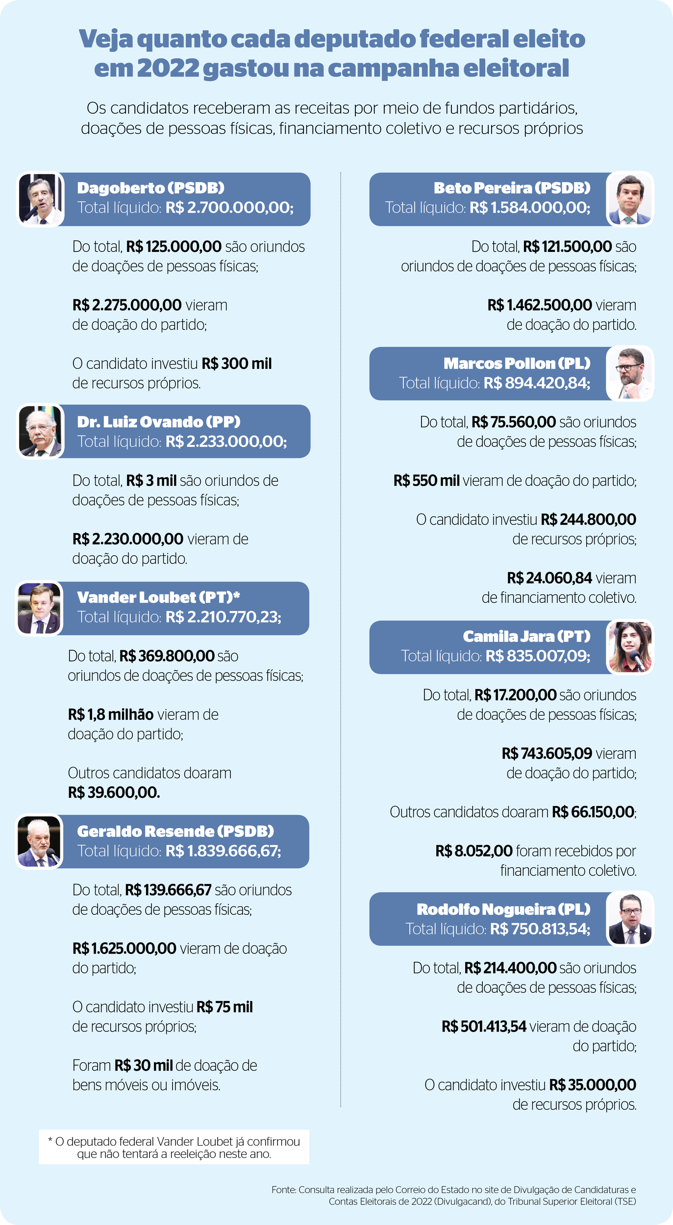 Como o deputado federal Vander Loubet (PT) já confirmou que neste ano tentará uma vaga para senador da República, a reportagem vai utilizar apenas sete dos oito parlamentares que se declararam pré-candidatos à reeleição, entretanto, no quadro que ilustra esta matéria estão os gastos dos oito parlamentares eleitos para representar Mato Grosso do Sul na Câmara dos Deputados nas eleições gerais de 2022.