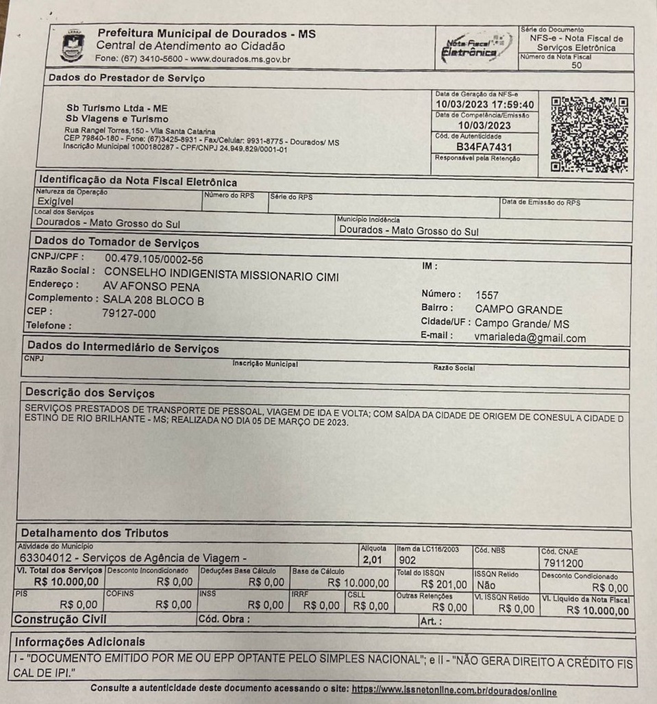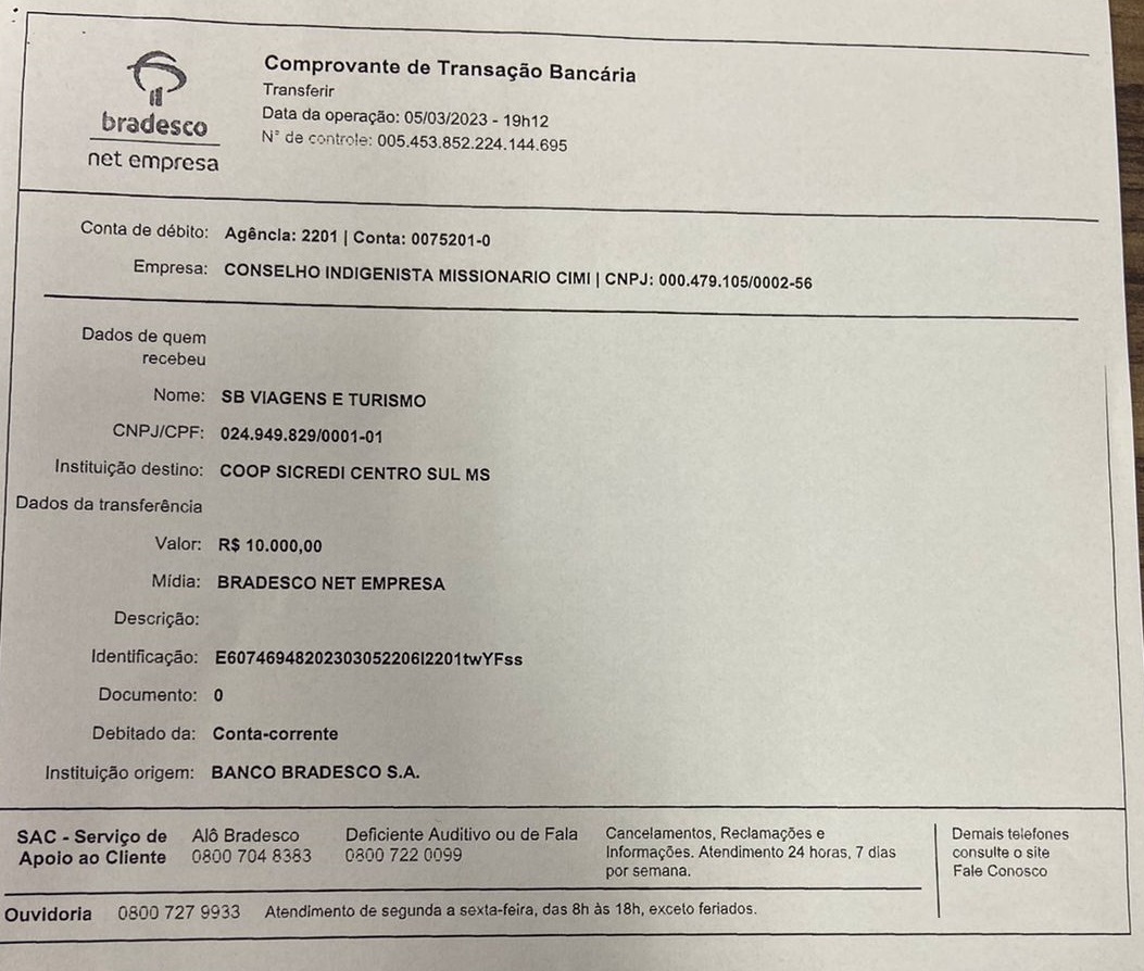 Notas fiscais anexadas ao inquérito aponta que o Cimi teria pago R$ 10 mil à empresa Anjos Transporte e Turismo, de Amambai, e R$ 10 mil para a SB Turismo, de Dourados, além de declarações das empresas que afirmaram terem sido contratadas para o transporte de indígenas, facilitando a invasão em Rio Brilhante, segundo Coronel David.