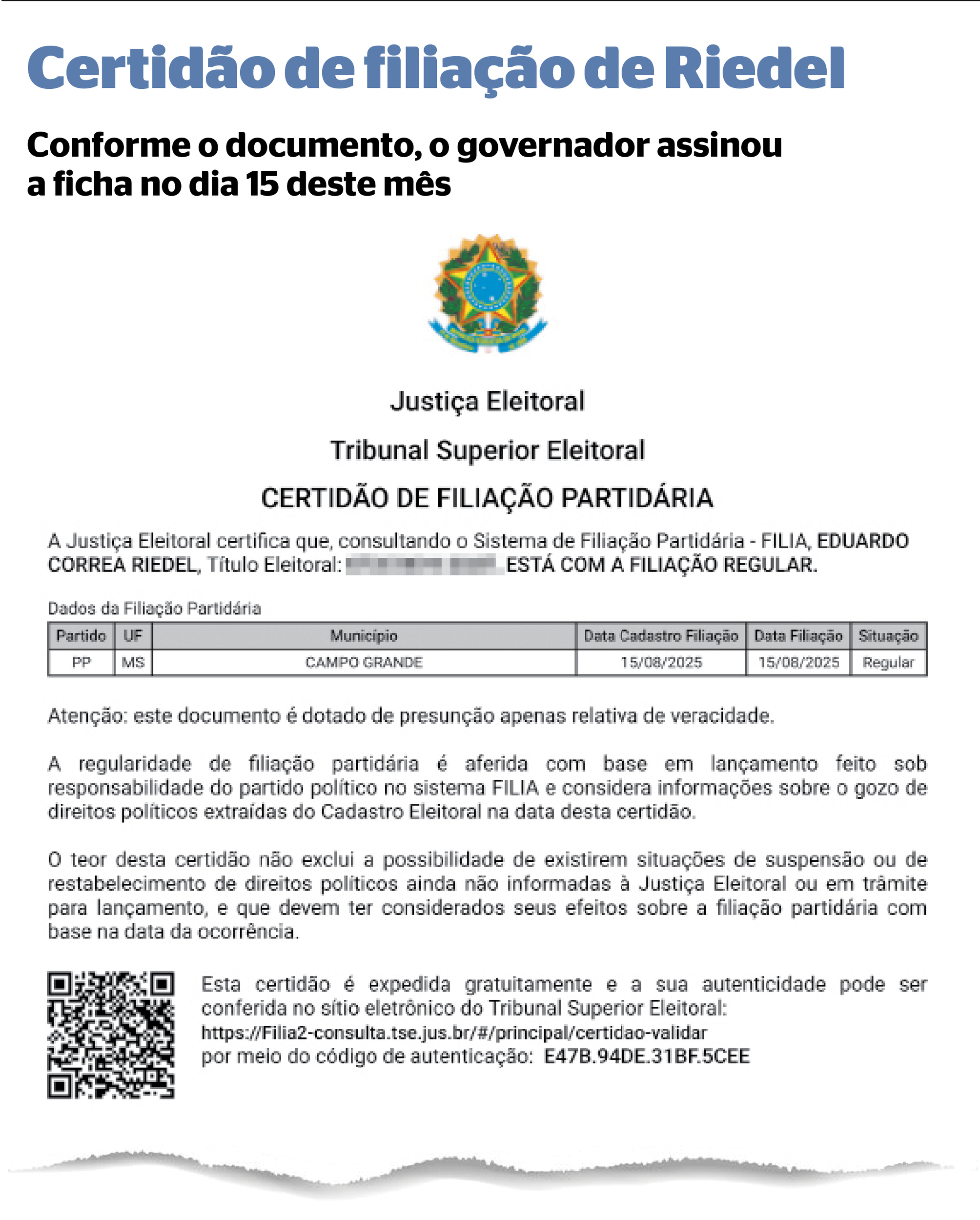 O governador Eduardo Riedel assinou na sexta-feira a ficha de filiação ao PP, conforme consta na sua certidão de filiação partidária, disponibilizada no site do Tribunal Superior Eleitoral (TSE), e hoje vai a Brasília (DF) para participar da convenção nacional do partido, às 8h (horário de Mato Grosso do Sul), no Auditório Petrônio Portela, no Senado, para sacramentar a federação União Progressista, formada pela legenda com o União Brasil.