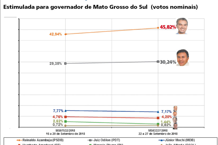 Nessa rodada de pesquisa, Azambuja passou de 42,94% para 45,82%, crescimento de 2,88 pontos porcentuais. Já o juiz federal aposentado Odilon de Oliveira oscilou de 29,35% para 30,24%, que dá 0,89 ponto.