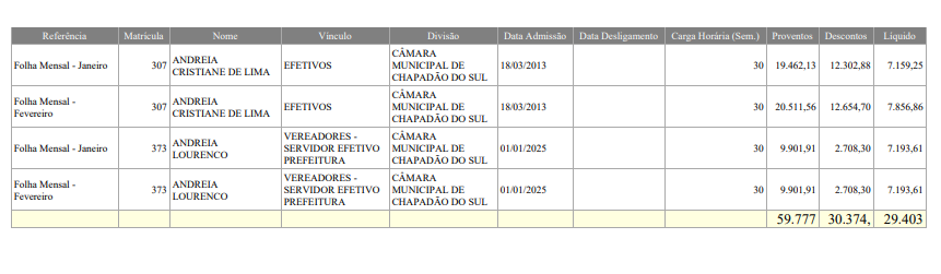 - Andreia Cristiane de Lima, servidora efetiva desde 18 de março de 2013, recebeu em janeiro deste ano remuneração bruta de R$ 19.462,13;