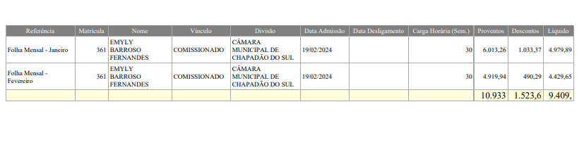 - Emily Barroso Fernandes, comissionada, admitida em 19 de fevereiro de 2024, recebeu em janeiro R$ 6.013,26 (bruto);