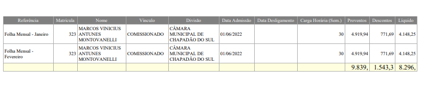 - Marcos Vinicius Antunes Montovanelli, comissionado, contratado em 1º de fevereiro de 2022, recebe salário de R$ 4.919,94.