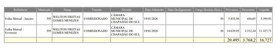 Como é o caso do servidor Weliton Freitas Gomes Menezes, que exerce o cargo de assessor jurídico da Câmara Municipal, em cargo comissionado. Conforme o Portal da Transparência do município, em janeiro recebeu salário de R$ 5.855,98 e, em fevereiro, R$ 14.639,95.