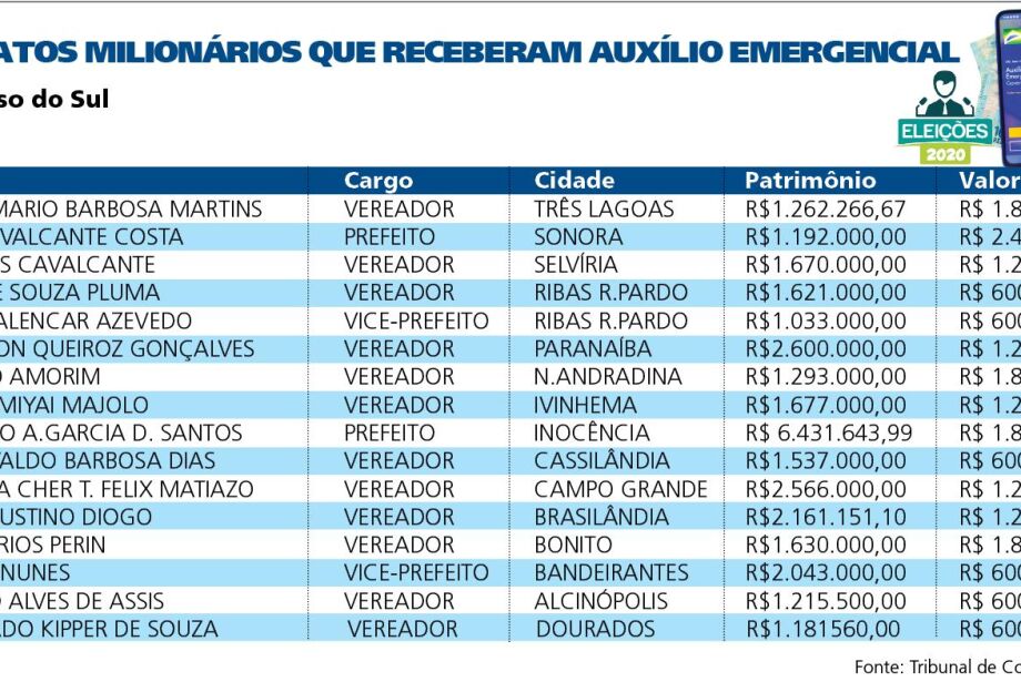 Com 155 candidatos a prefeito, vice-prefeito e a vereador que receberam o auxílio emergencial, Mato Grosso do Sul tem, pelo menos, 16 candidatos milionários que, ainda assim, receberam o benefício do governo federal, voltado a pessoas vulneráveis que ficaram sem renda durante a pandemia da Covid-19.