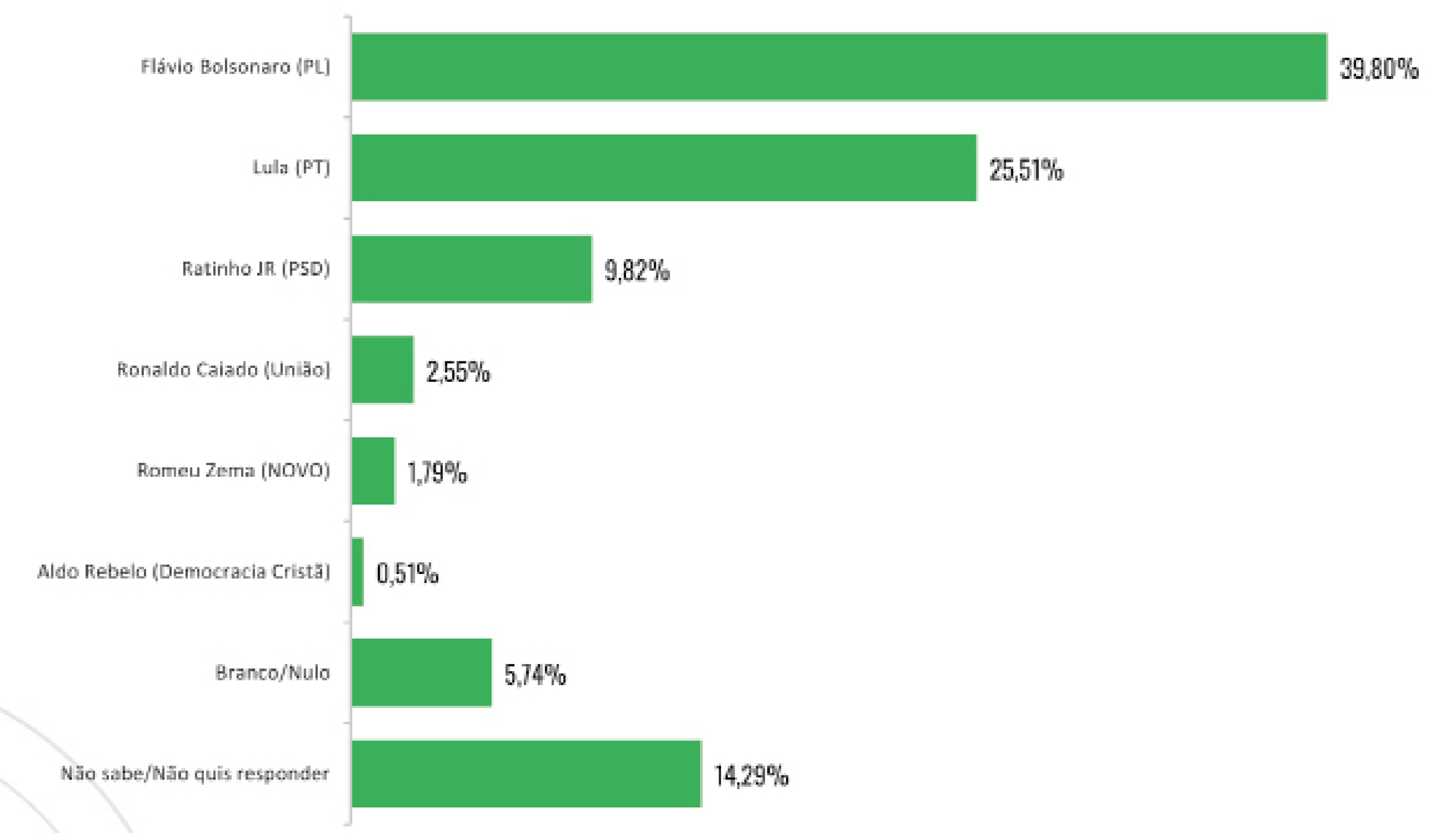 Conforme o levantamento estimulado, quando são apresentadas aos entrevistados as opções com os nomes dos candidatos, Flávio Bolsonaro atingiu a marca de 39,80%, enquanto o presidente da República, Luiz Inácio Lula da Silva (PT), alcançou 25,51% e o governador do Paraná, Ratinho Júnior (PSD), somou 9,82%.