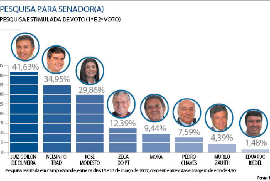 O juiz federal Odilon de Oliveira e o ex-prefeito de Campo Grande Nelsinho Trad (PTB) são os preferidos dos eleitores da Capital para assumirem as duas vagas no Senado a partir de 2019. A pesquisa foi feita pelo Ipems (Instituto de Pesquisas de Mato Grosso do Sul Ltda.) com 400 pessoas entre os dias 15 a 17 deste mês. Se as eleições fossem hoje, Odilon receberia maior votação. Ele teria 41,63% das intenções de voto, enquanto Nelsinho conquistaria a segunda vaga com 34,95%.