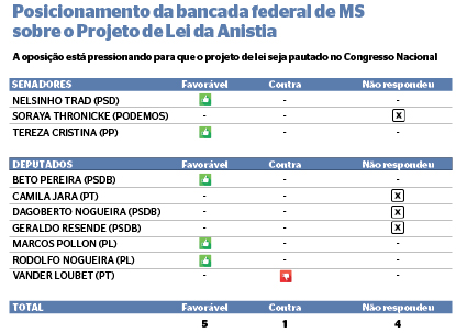 FONTE: Correio do EstadoO Correio do Estado procurou os 11 integrantes da bancada federal de Mato Grosso do Sul no Congresso Nacional – três senadores e oito deputados federais –, e a maioria se posicionou favoravelmente a que seja pautado e aprovado o projeto de lei de anistia para os condenados e investigado pelo 8 de Janeiro, já incluindo o ex-presidente da República (veja quadro).