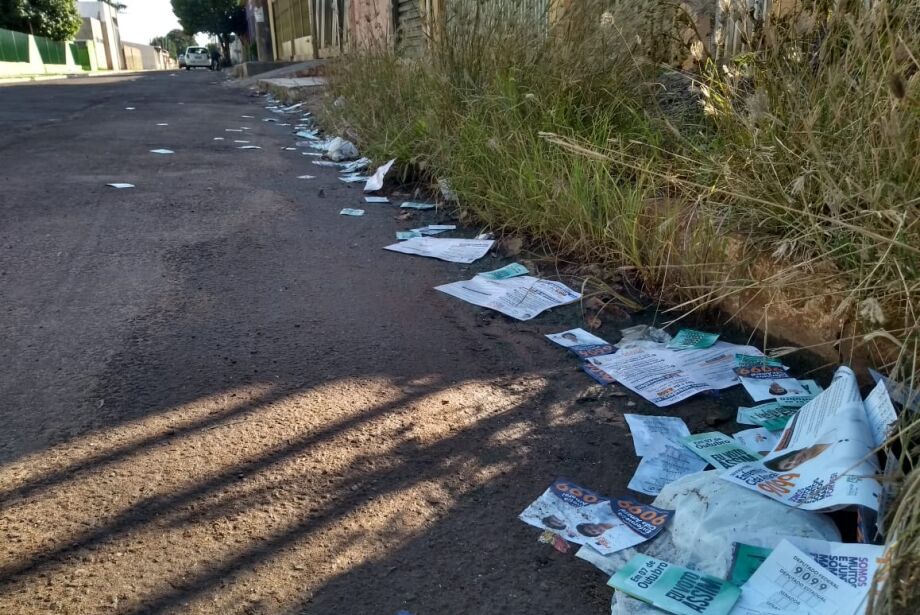 Na calçada da escola a reportagem flagrou diversos materiais de divulgação dos candidatos, os “santinhos” da enfermeira Cida, delegado Wellington, Júnior Longo, Batata, Eliseu Dionísio, Jorge Martins, Fábio Trad, Beto Pereira e Jamil.