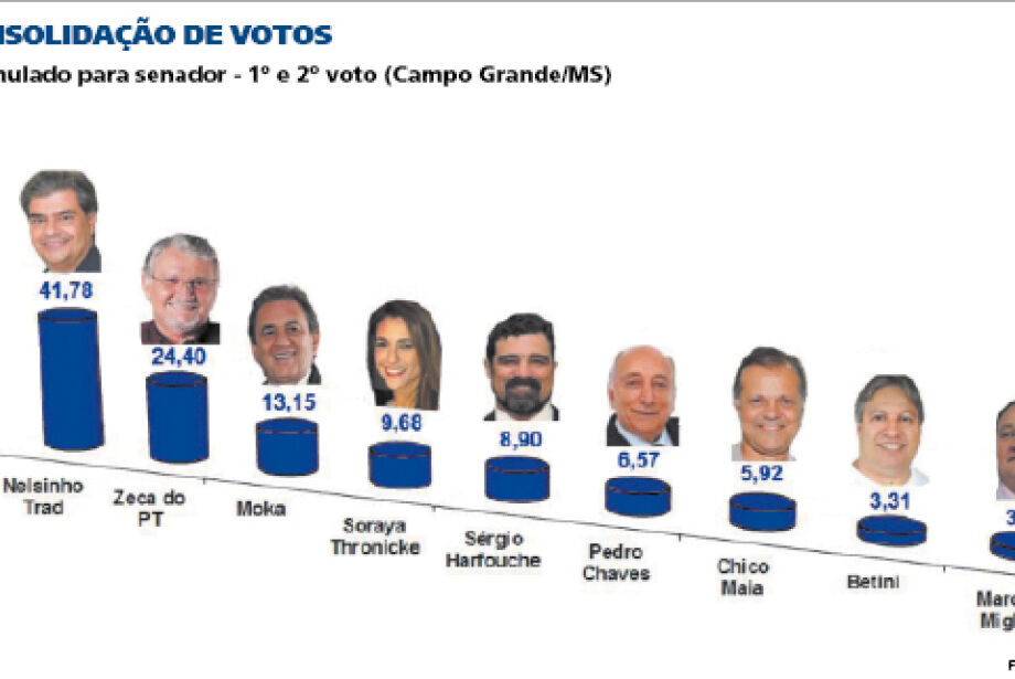 Dos nove pré-candidatos a senador, a pesquisa do Instituto de Pesquisas de Mato Grosso do Sul Ltda. (Ipems) mostra o ex-prefeito de Campo Grande Nelsinho Trad (PTB) liderando por larga vantagem a preferência do eleitor da Capital como pré-candidato ao Senado Federal. Se as eleições fossem hoje, ele teria 41,78% das intenções de voto no maior colégio do Estado, onde concentra 591.374 eleitores.
