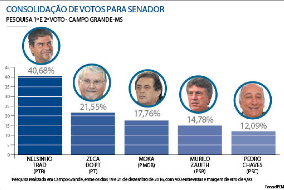 O senador Waldemir Moka, com planos de concorrer à reeleição, conta com 17,76% das intenções de voto na Capital. Em 2010, ele teve vitória apertada sobre os deputados federais (na época) Murilo Zauith (PSB) e Dagoberto Nogueira (PDT).
