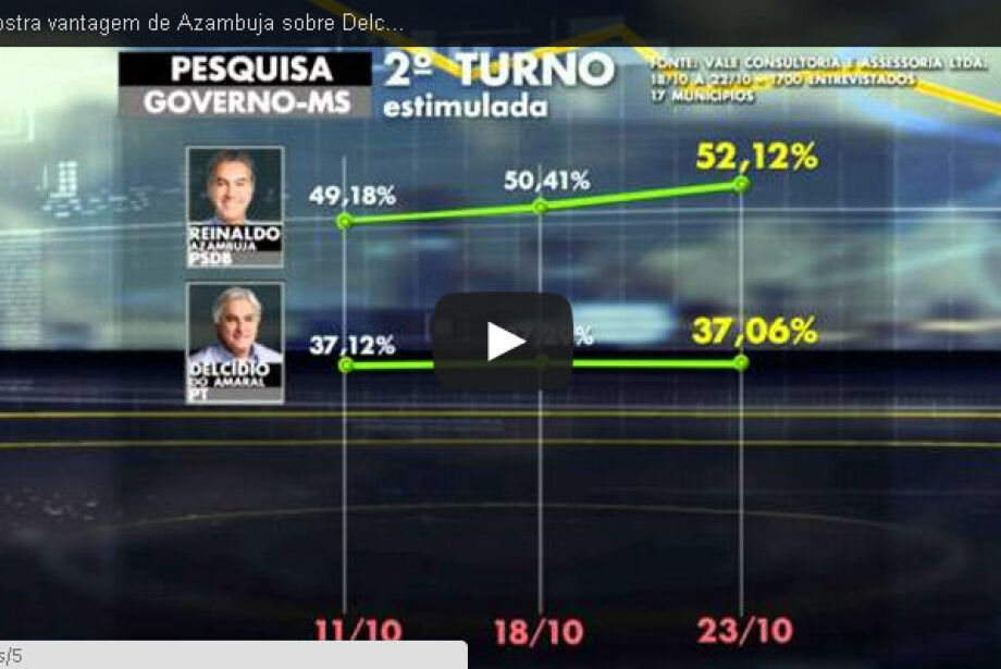 Pesquisa da Vale Consultoria e Assessoria Ltda, feita a pedido do SBT MS e divulgada nesta quinta-feira (23), mostra o candidato ao Governo do Estado Reinaldo Azambuja (PSDB) com 15 pontos de vantagem sobre Delcídio do Amaral (PT), a três dias da eleição do segundo turno.
