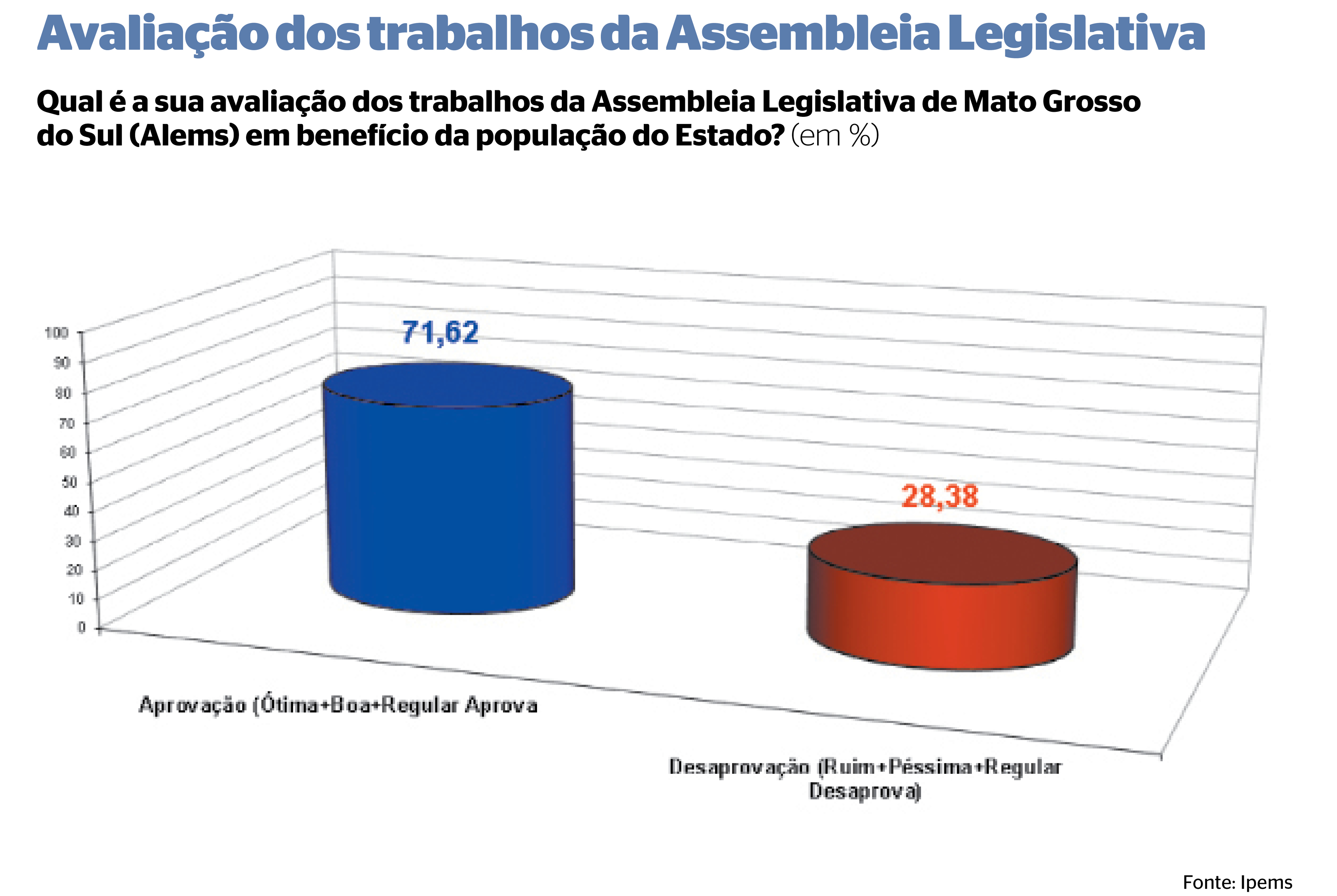 Pesquisa realizada pelo Correio do Estado e o Instituto de Pesquisas de Mato Grosso do Sul (Ipems), com 1.611 eleitores, em 53 municípios de Mato Grosso do Sul, no período de 22 de julho a 1º de agosto deste ano, apontou que os trabalhos da Assembleia Legislativa de Mato Grosso do Sul (Alems) têm a aprovação de 71,62% da população e a desaprovação de 28,38%.