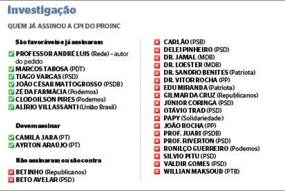 Até a tarde de ontem, além do vereador André Luis, tinham assinado o pedido da CPI os vereadores Coronel Alírio Villasanti (União Brasil), Clodoilson Pires (Podemos), João César Mattogrosso (PSDB), Zé da Farmácia (Podemos), Marcos Tabosa (PDT) e Tiago Vargas (PSD). Outros dois nomes confirmaram em bastidores que assinarão o pedido.