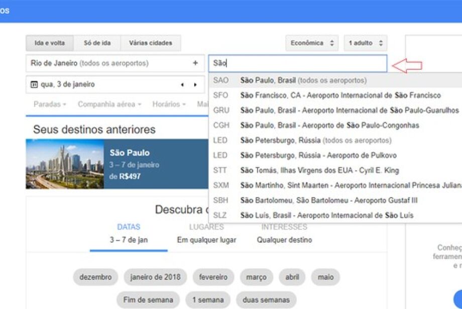 Passo 1. Entre no Google Flights e escolha as cidades de origem e destino, as datas da sua viagem e a quantidade de passageiros.