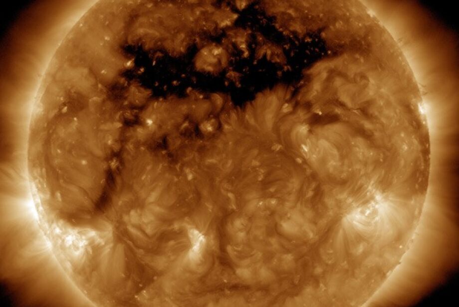 A Nasa divulgou, nesta quarta-feira (14), a imagem de um grande buraco coronal, região mais escura e de baixa densidade no Sol.