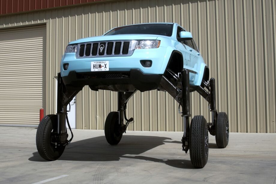 Chamado de Hum Rider, o conceito da Verizon utiliza sistema hidráulico, alimentado por um motor Honda, para fazer um Jeep Grand Cherokee passar por cima dos veículos.