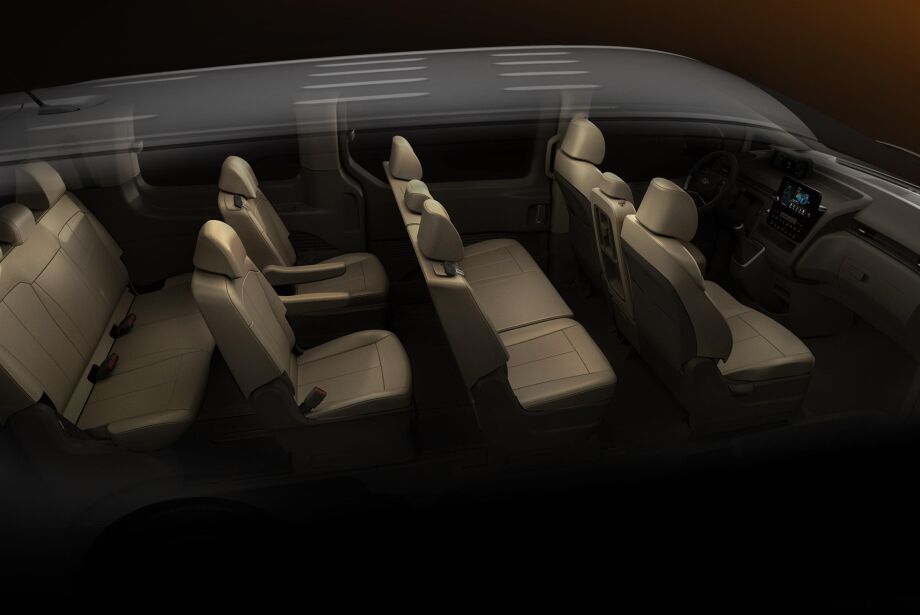 A Staria Premium de nove lugares tem assentos na segunda fila com a capacidade adicional de girar 180 graus para ver de frente os passageiros na terceira fila.