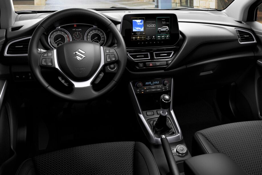 Dentro, o novo S-Cross estreia a multimídia com tela de 9 polegadas com espelhamento de smartphones com Apple CarPlay e Android Auto, ficando em uma posição mais elevada, o que facilita a sua utilização, e um vinco bem pronunciado no lado direito do painel.