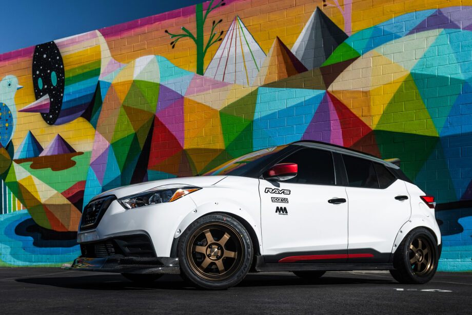 A Nissan pisou forte no acelerador em seu estande na edição de 2019 do Salão Sema (Specialty Equipment Market Association), realizado em Las Vegas, destinado para versões especiais de veículos de produção. As surpresas preparadas pela marca oriental incluem uma unidade do esportivo 370Z de competição na versão Global Time Attack TT, uma picape Frontier Desert Runner turbinada e um Kicks Street Sport. A carroceria do Kicks foi radicalmente transformada com toques do Kicks Color Studio e peças customizadas de trezentos e sessenta Composites – com um spoiler dianteiro de tamanho avantajado, um spoiler traseiro de teto e saias laterais. A MA Motorsports fabricou os alargadores de para-lamas para que se adaptassem às rodas Volk Racing TE37V 17x8.5. Para ajudar o Kicks Street Sport no quesito atitude, uma suspensão customizada foi fabricada para entregar uma dirigibilidade digna do nome, utilizando uma combinação de amortecedores Nismo/Öhlins do tipo “coil over”.