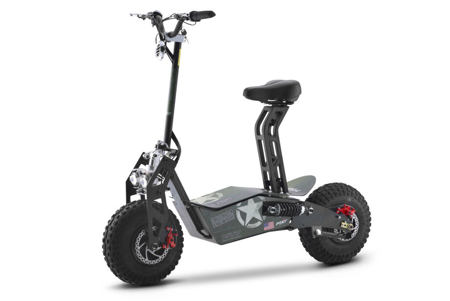 Patinete elétrico MXF MUV MilitarySão dois modelos: com motor de mil Watts e outro de 1.600 Watts. Segundo a fabricante, eles enfrentam qualquer tipo de terreno, vem com quatro baterias de 12V (12Ah), totalizando 48V (48Ah), que garantem um percurso médio de até vinte e cinco quilômetros com velocidade média de 50 km/h. O tempo estimado para a recarga é de até seis horas, nas voltagens 110 V e 240 V. A estrutura do MUV é maior do que a maioria dos patinetes existentes no mercado, sendo do tamanho aproximado de uma scooter. Seu banco é removível e seu guidão é dobrável, possibilitando o transporte no porta-malas do carro ou do ônibus. Além disso, tem assento regulável, e faróis e painel em leds, que marca a quantidade de carga da bateria. São três cores diferentes: verde militar, preto e vermelho. Existem ainda acessórios opcionais, como bolsas utilitárias. Os preços partem de R$ 5.305. Mais informações no site www.mxfmotors.com.br .