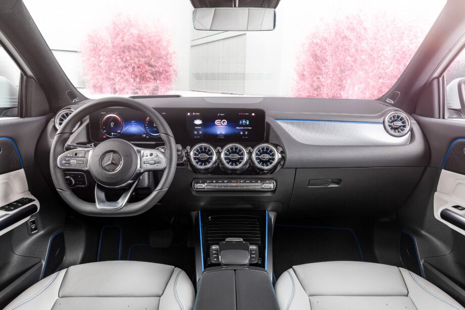 O sistema de infoentretenimento MBUX vem com duas telas de 7,0 polegadas (opcionalmente, podem ser duas de 10,25 polegadas), head-up display colorido, assistente de voz e sistema de navegação Electric Intelligence. Com base em simulações contínuas de distância, o navegador calcula o percurso mais rápido até o destino escolhido levando em consideração postos de carregamento da bateria, topografia do percurso e meteorologia, podendo ainda reagir dinamicamente a mudanças como as condições de trânsito ou o estilo de condução.