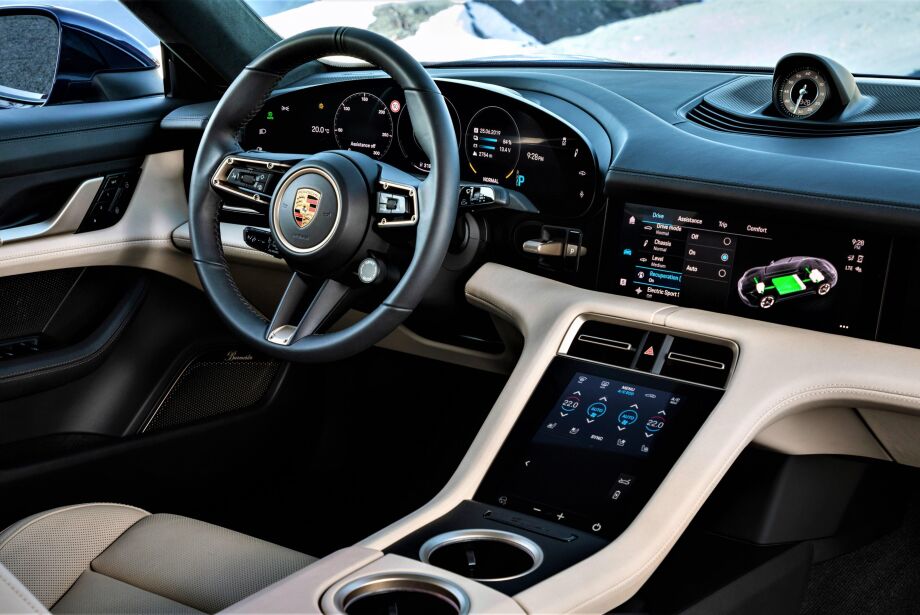 O interior do Taycan tem estrutura clara e uma arquitetura completamente nova. O painel de instrumentos é curvado e independente, colocando um ponto de fixação da visão do motorista como prioridade. Uma tela de infoentretenimento central de 10,9 polegadas e uma opcional do passageiro são combinadas para formar uma faixa de vidro integrada com uma aparência de painel preto. Todas as interfaces do usuário foram completamente projetadas para o Taycan. O número de controles clássicos de hardware, como interruptores e botões, foi bastante reduzido. O controle é inteligente e intuitivo − usando a operação de toque ou a função de controle de voz, que responde ao comando “Hey Porsche”.