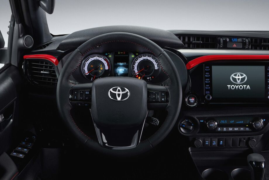 O design interno da Hilux GR-S é marcado pelos bancos revestidos de couro preto perfurado com fundo vermelho, em sintonia com as costuras na mesma cor dos braços, do freio de mão e do console central. O estofamento no teto e as colunas na cor preta reforçam ainda mais as características estilísticas da Gazoo Racing. O botão de partida smart key, a placa numerada que identifica o número da unidade no console central, os apoios de cabeça e os tapetes com o logo “GR” arrematam o visual interno. Além disso, a nova GR-S incorpora uma câmera frontal no para-brisa para gravação com qualidade full-HD, ideal para ser usada como meio de segurança e registro, pois permite que seja configurada para gravar continuamente (estilo de câmera de segurança).