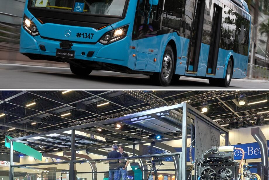 No estande da marca alemã, que lidera o mercado brasileiro de chassis de ônibus há 65 anos e atualmente responde por mais de 50% dos emplacamentos do setor, a principal atração foi o chassi elétrico urbano eO500U, já em produção na fábrica de São Bernardo do Campo/SP – também estava disponível em um modelo encarroçado para test-drive na área externa do São Paulo Expo. Como a tecnologia de ônibus elétricos ainda é para poucos – os veículos recarregáveis em tomadas são muito mais caros que os movidos a diesel e as estruturas para recarga ainda são incipientes no Brasil –, a Mercedes-Benz apresentou também a nova linha de chassis de ônibus com tecnologia BlueTec 6 para atendimento à nova legislação de emissões Proconve P8. As novas versões de motores a diesel OM 924 LA, OM 926 LA e OM 460 LA Euro 6 têm a proposta de emitir menos 80% de óxidos de nitrogênio e menos 50% de material particulado em relação à norma Euro 5, vigente até o fim do ano. Na área externa, a marca da estrela de três pontas disponibilizou testes do O 500 RSDD com sistema de frenagem de emergência ABA5 e do assistente de ponto cego SGA.