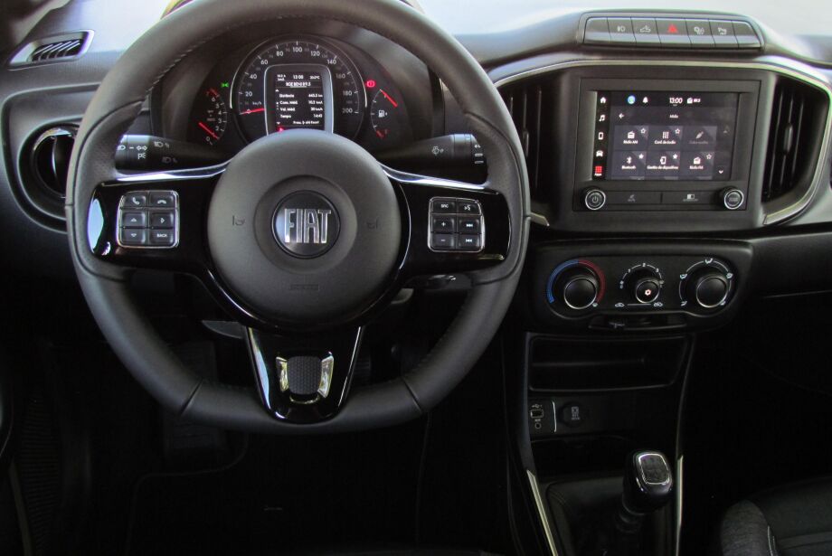 Os tempos das picapes compactas de cabine dupla com bancos traseiros acochambrados e de aspecto um tanto tosco ficaram no passado na linha Strada. A versão com cabine dupla da geração anterior, com porta traseira apenas do lado direito, levava só dois passageiros atrás, em um espaço exíguo e recomendável apenas para viagens rápidas. Na nova versão cabine dupla da picape da Fiat, o banco traseiro acomoda três adultos com conforto similar ao proporcionado pelo hatch Argo. As portas dianteiras se abrem em 70 graus e as traseiras, em 80 graus, para facilitar o acesso. O passageiro do banco central também conta com cinto de três pontos e encosto de cabeça. No acabamento interno, apesar da Volcano ser uma versão topo de linha, os mesmos plásticos duros das configurações básicas estão presentes em todo o painel e nas portas.
